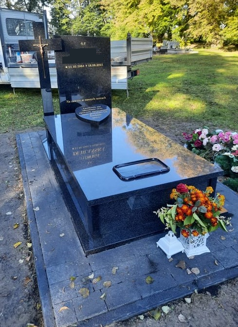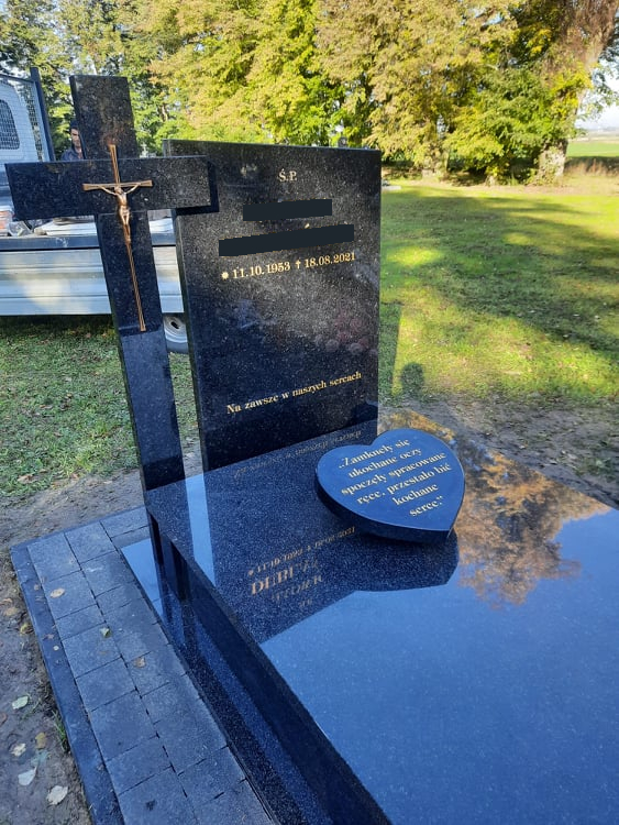 Nagrobek w miejscowości Dyniska, w gminie Ulhówek to kolejna nasza realizacja na tym cmentarzu. Pomnik został wykonany z granitu o nazwie Bonacord. Na parapetach zostały ustawione obłożyny z narożnikami, a na to prostokątna płyta pokrywowa. Krzyż oraz tablica w odróżnieniu od większości nagrobków, ustawione są bezpośrednio na parapetach. Tablica od strony krzyża jest nieco wyższa niż po zewnętrznej stronie. Napisy wykonano w kolorze złotym. Charakterystyczną cechą nagrobka jest kamienne serce leżące na pokrywie. Dookoła nagrobka została ułożona kostka brukowa.
