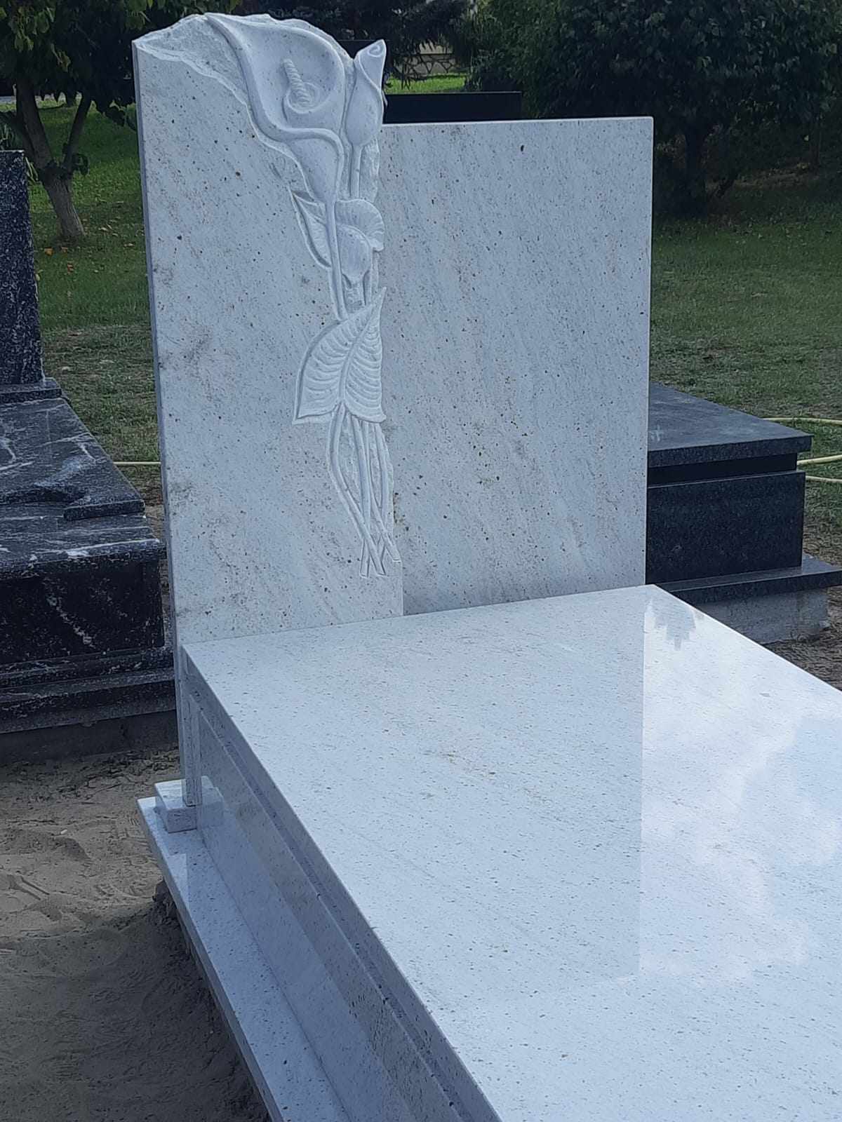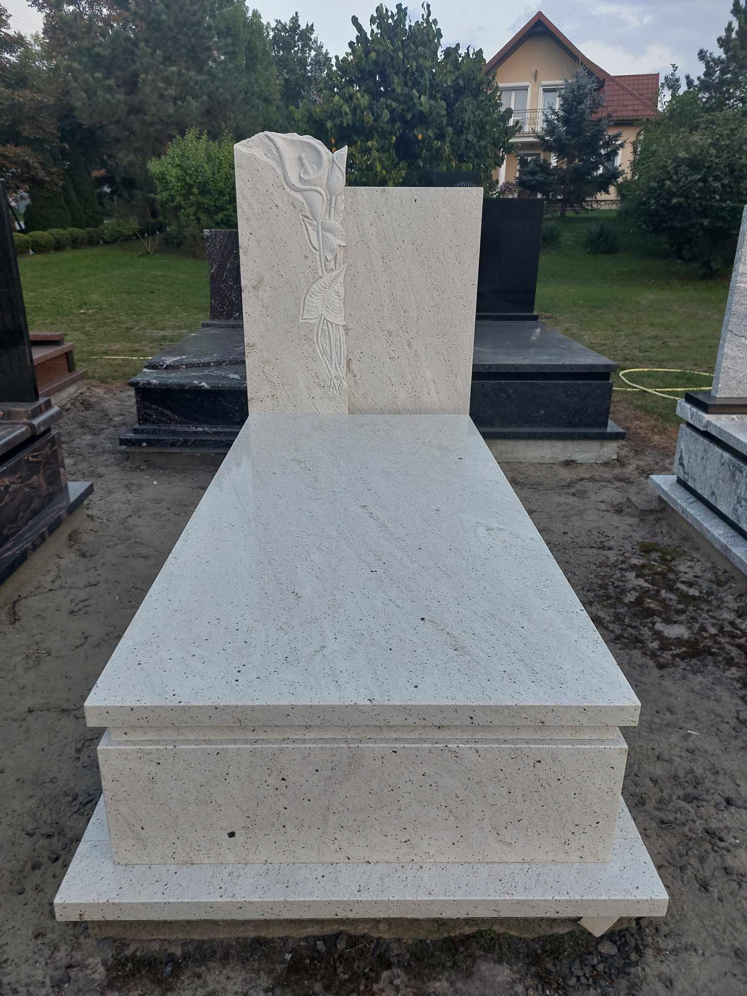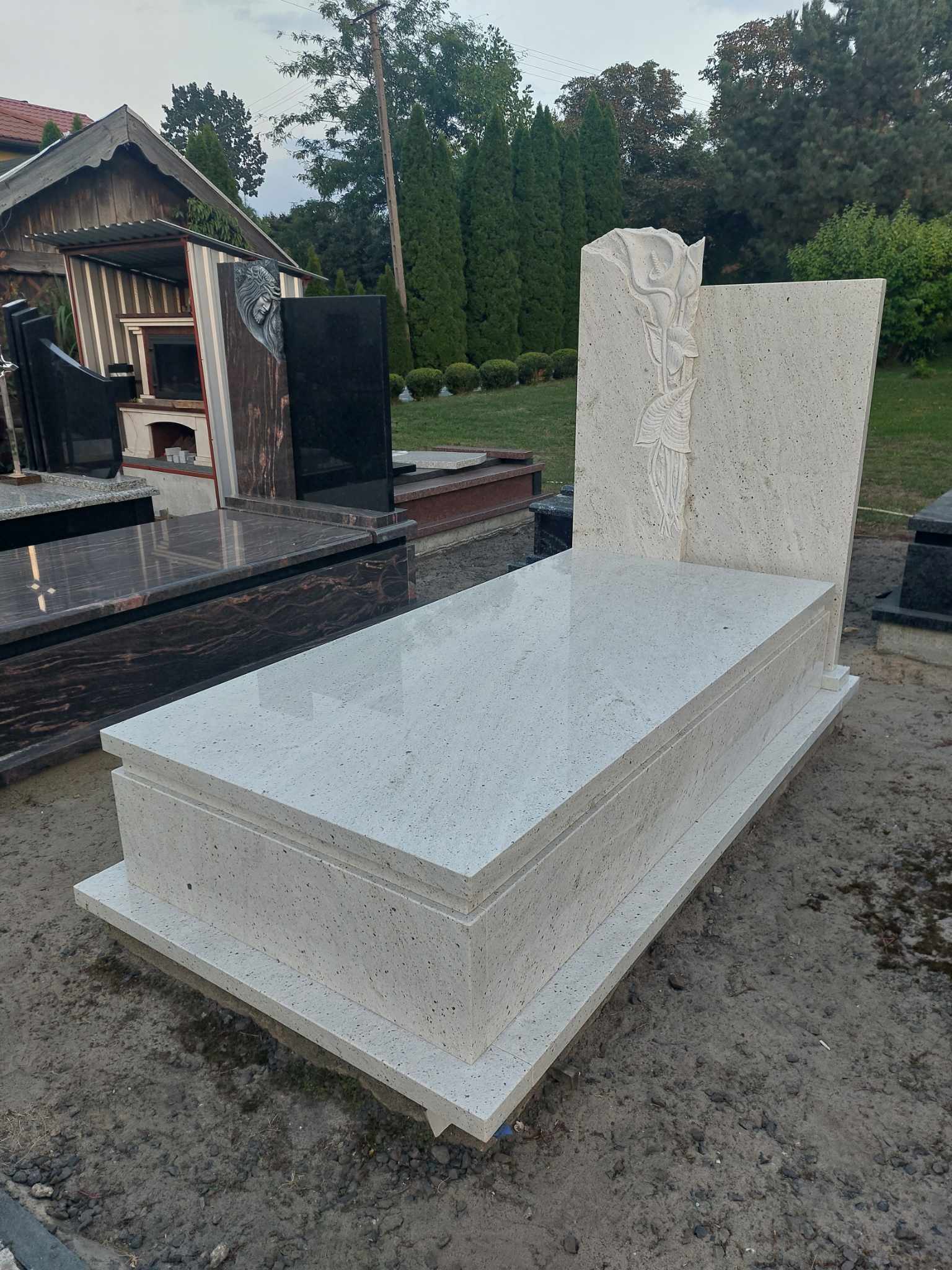 Jasny nagrobek z rzeźbą Nagrobek monochromatyczny o prostej formie. Lewa część tablicy z rzeźbą z motywem roślinnym. Nagrobek do obejrzenia na naszej wystawie w Bełżcu na ul. Czarnieckiego 101. Może ci się spodobać również Nagrobek z płaskorzeźbą 2025-10-23 Nagrobek w Bełżcu 2025-11-13 Duży grobowiec rodzinny 2025-12-11