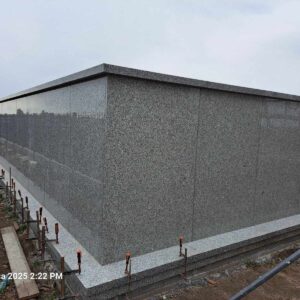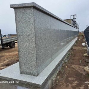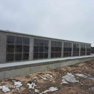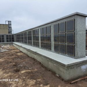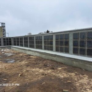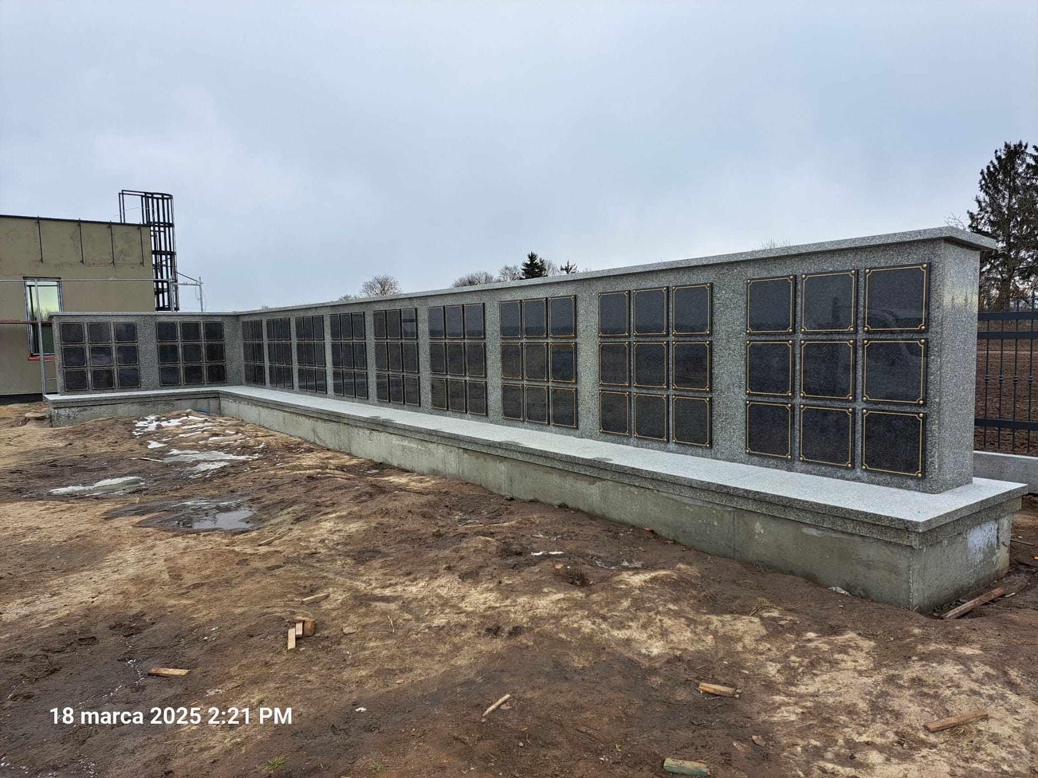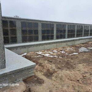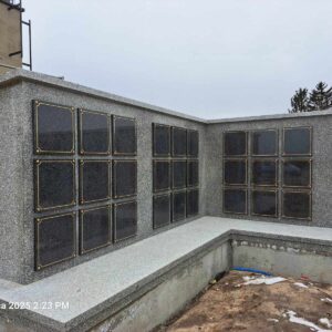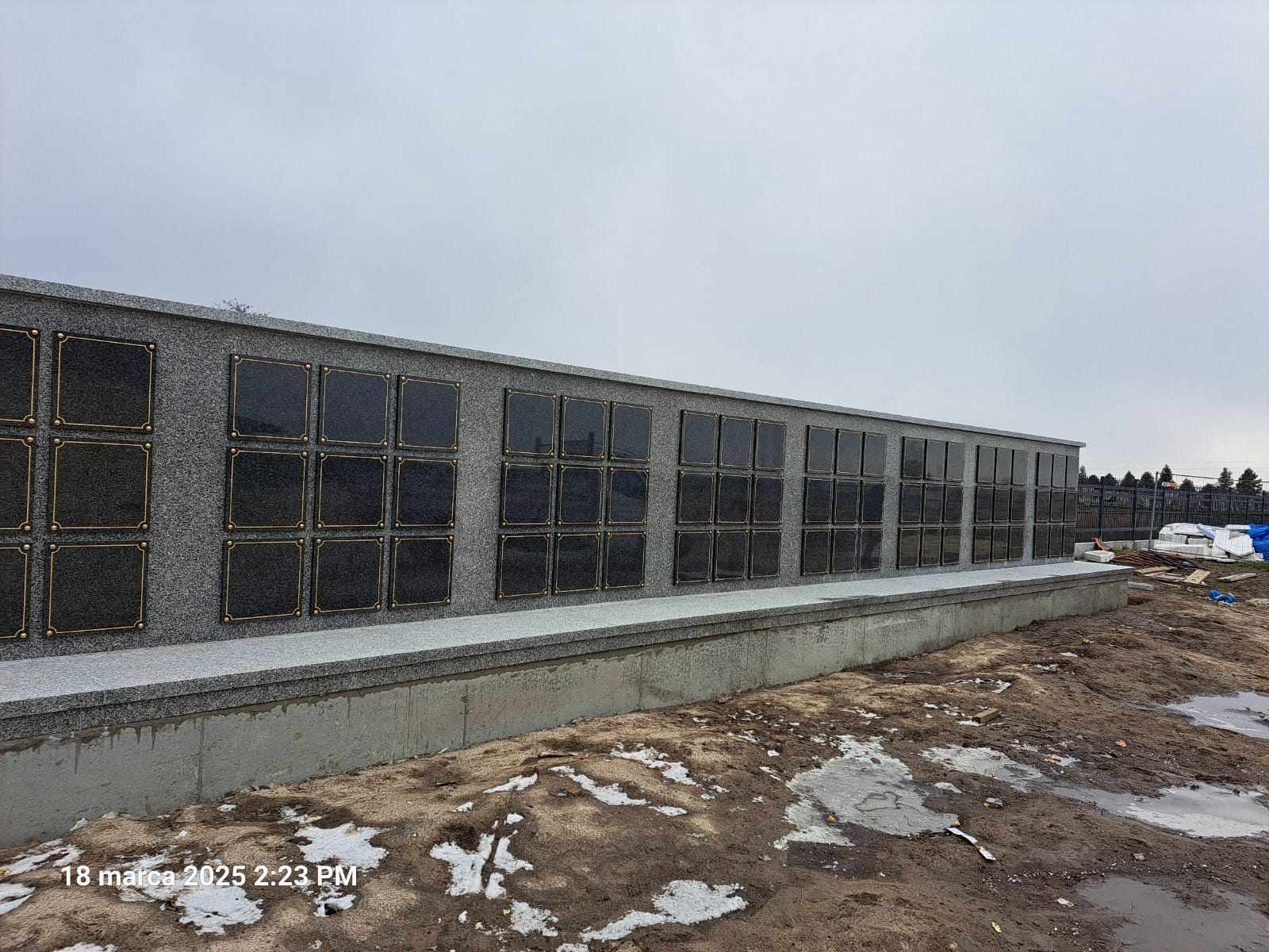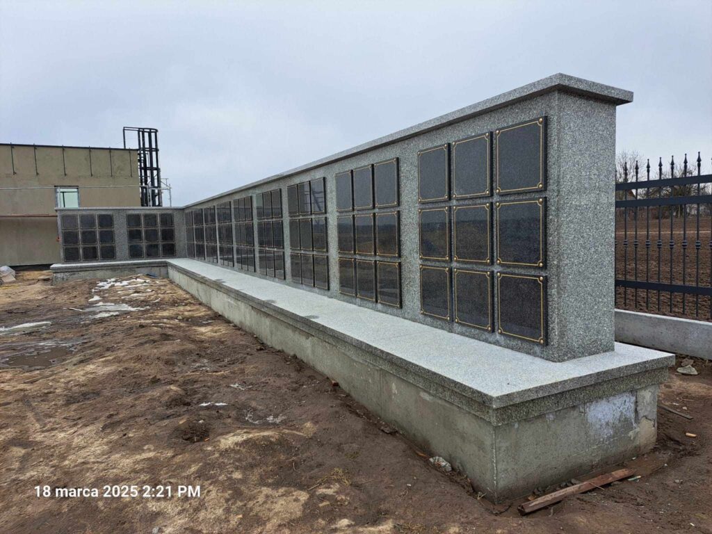 Kolumbarium wykonane przez nasz zakład kamieniarski powstało na cmentarzu w Łaszczowie. Budowla została obłożona w większości z polskiego granitu strzegomskiego. Jedynie 99 drzwiczek zdobionych złotym obramowaniem wykonano z czarnego kamienia. Obiekt na rzucie litery L składa się z podestu oraz muru z otworami przeznaczonymi na urny. Mur przykryty jest granitową czapą.