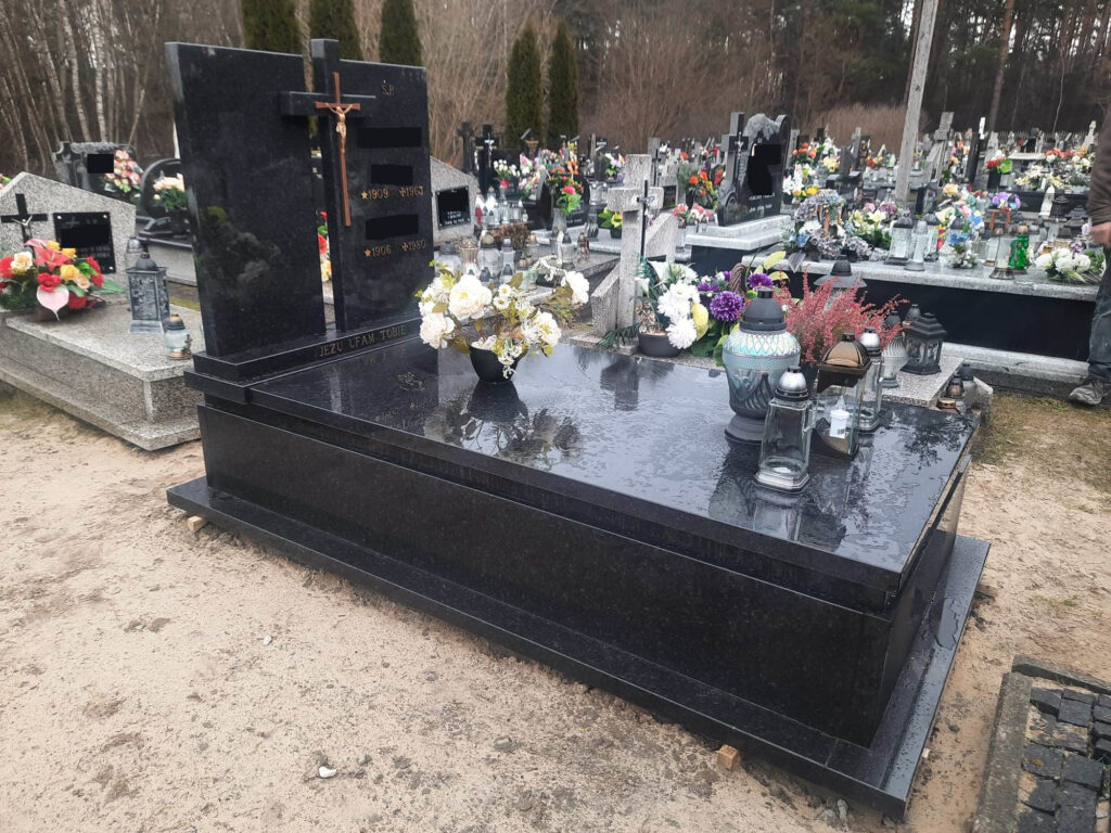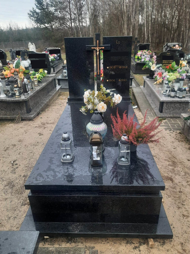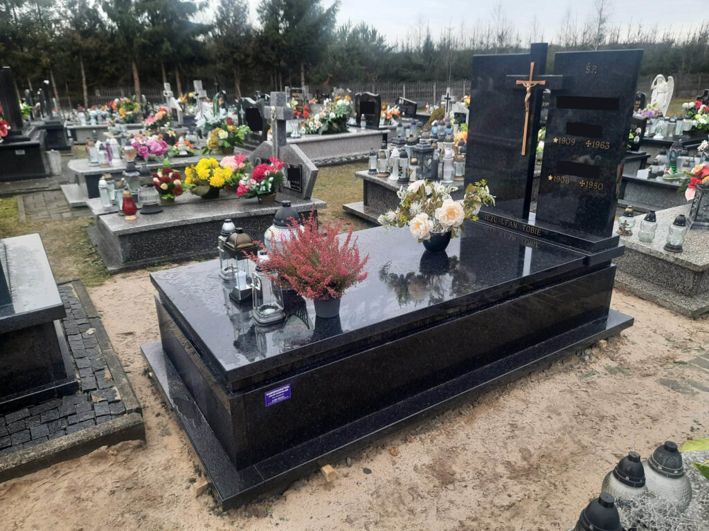 Zakład kamieniarski Piotr Komadowski wykonał pomnik w miejscowości Łukawica w gminie Narol (powiat lubaczowski). Nagrobek w całości jest zbudowany z ciemnego granitu o nazwie Nero Angola pochodzącego z Afryki. Monochromatyczna barwa kamienia wraz ze złotym krzyżem i napisami dodaje mu eleganckiego charakteru. Pomnik zbudowany jest na parapetach na których stoją obłożyny (bez tradycyjnych narożników, co nadaje pomnikowi nowoczesny styl), następnie nieco cofnięty pasek na którym lezy pokrywa. Dwie symetryczne, prostokątne tablice ustawione są na postumencie, pomiędzy nimi nieco wyższy kamienny krzyż do którego przyczepiony jest stalowy.