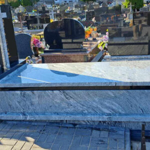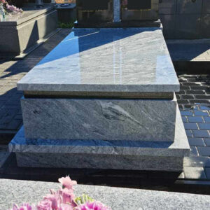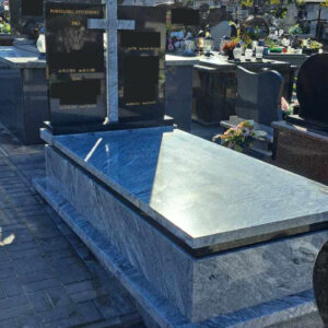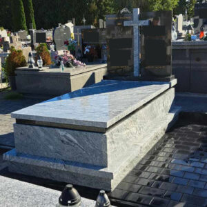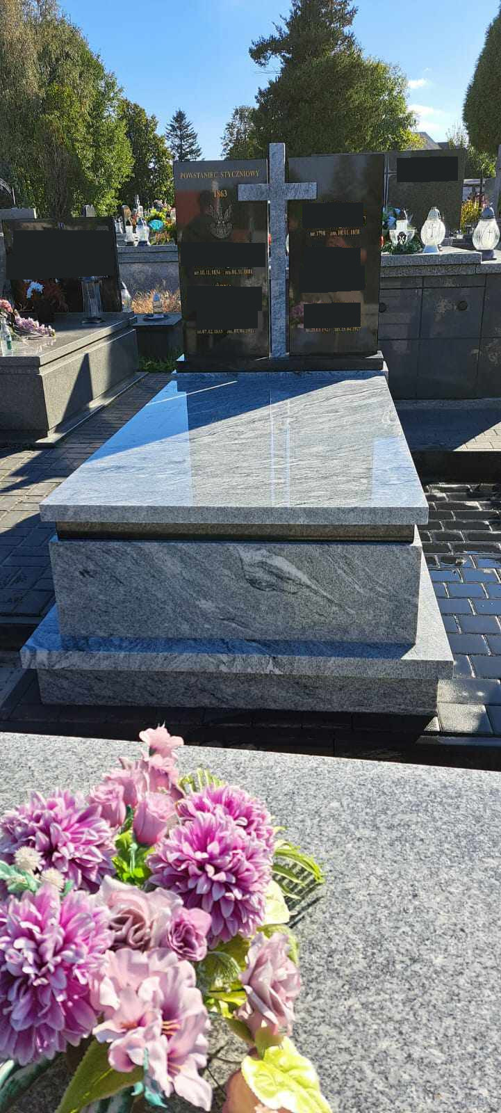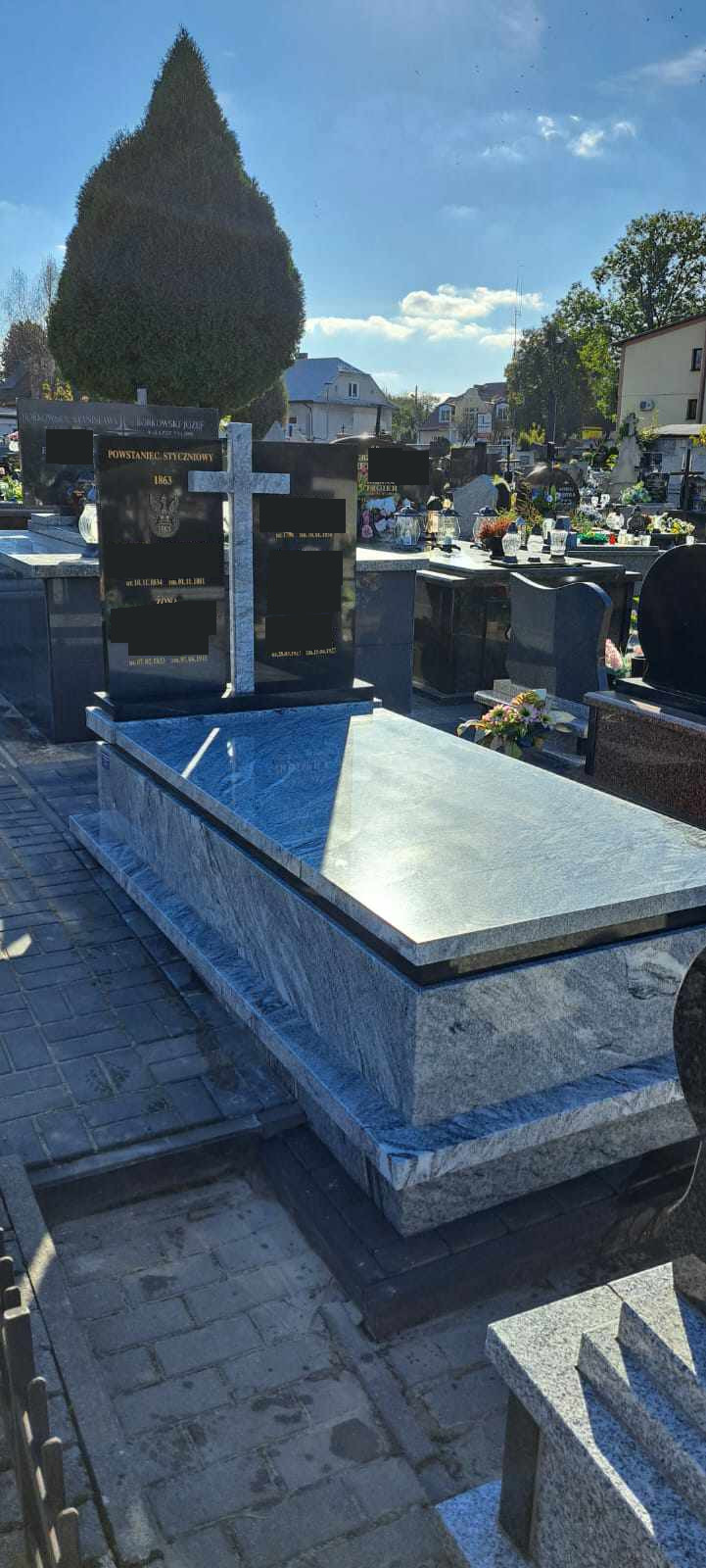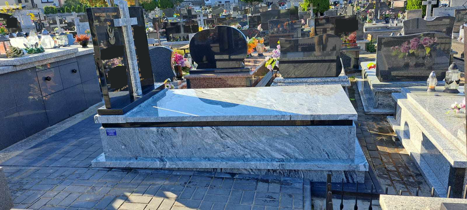 Nagrobek wykonany przez naszą firmę Kamieniarstwo, Nagrobki, Pomniki- Piotr Komadowski powstał na cmentarzu ,,Nowym” w Tomaszowie Lubelskim. Parapety, obłożyny oraz pokrywa grobowa została wykonana z jasnego granitu o nazwie Viscount White, natomiast pozostałe elementy z czarnego granitu o nazwie Monumental. Pokrywa grobowa spoczywa na cofniętym względem lica nagrobka czarnym pasku o grubości 5 cm. Dwie czarne tablice ustawiono z zachowaniem symetrii, pomiędzy tablicami ulokowano krzyż z jasnego kamienia. Napisy wykonano w kolorze złotym.