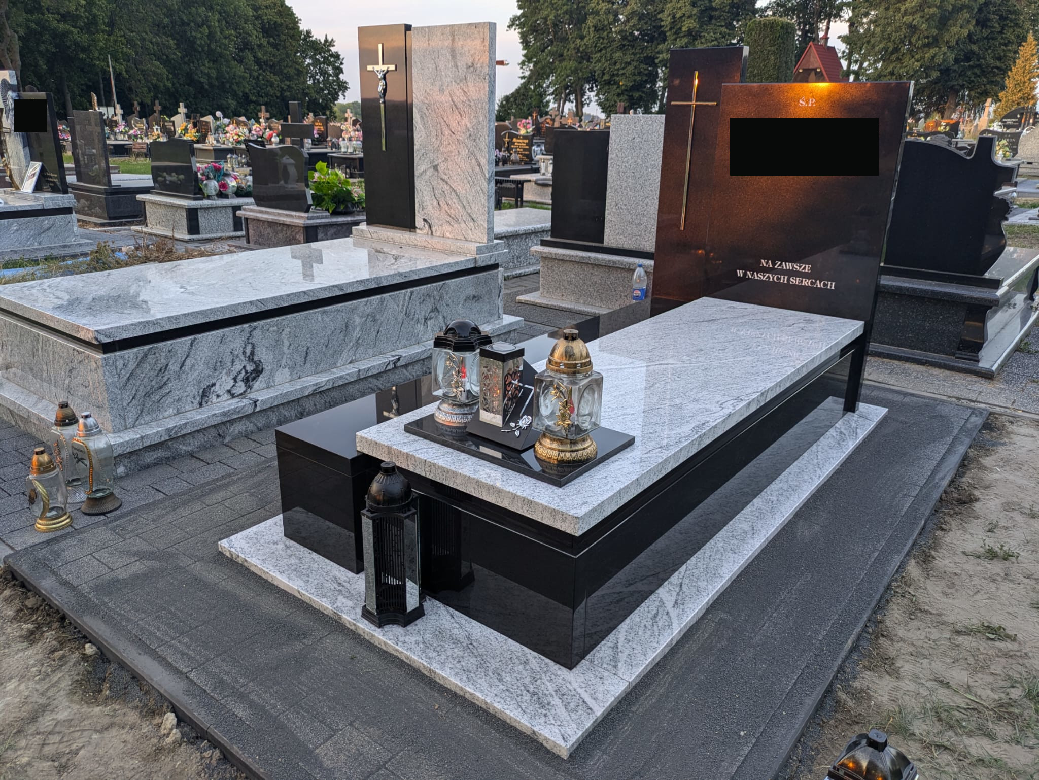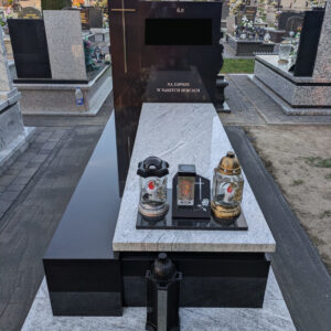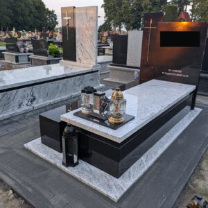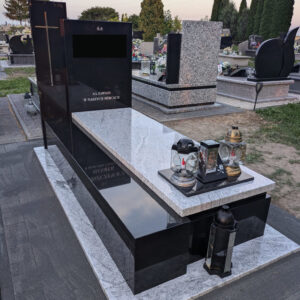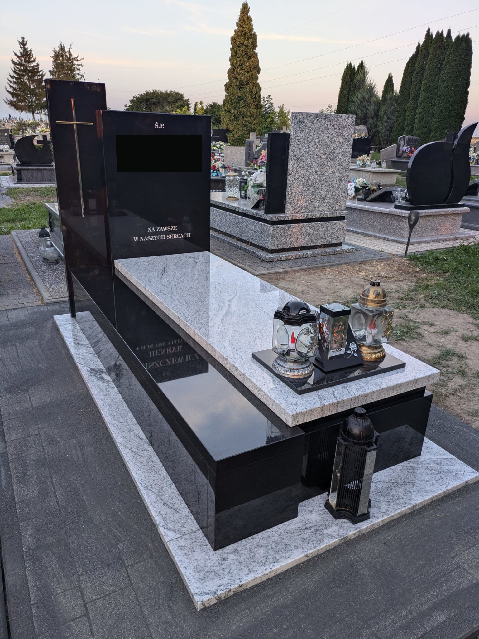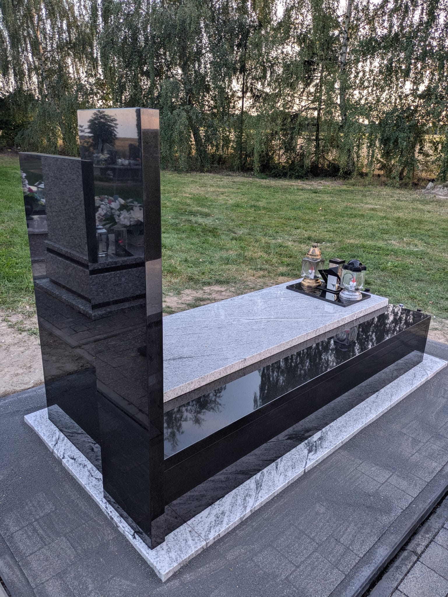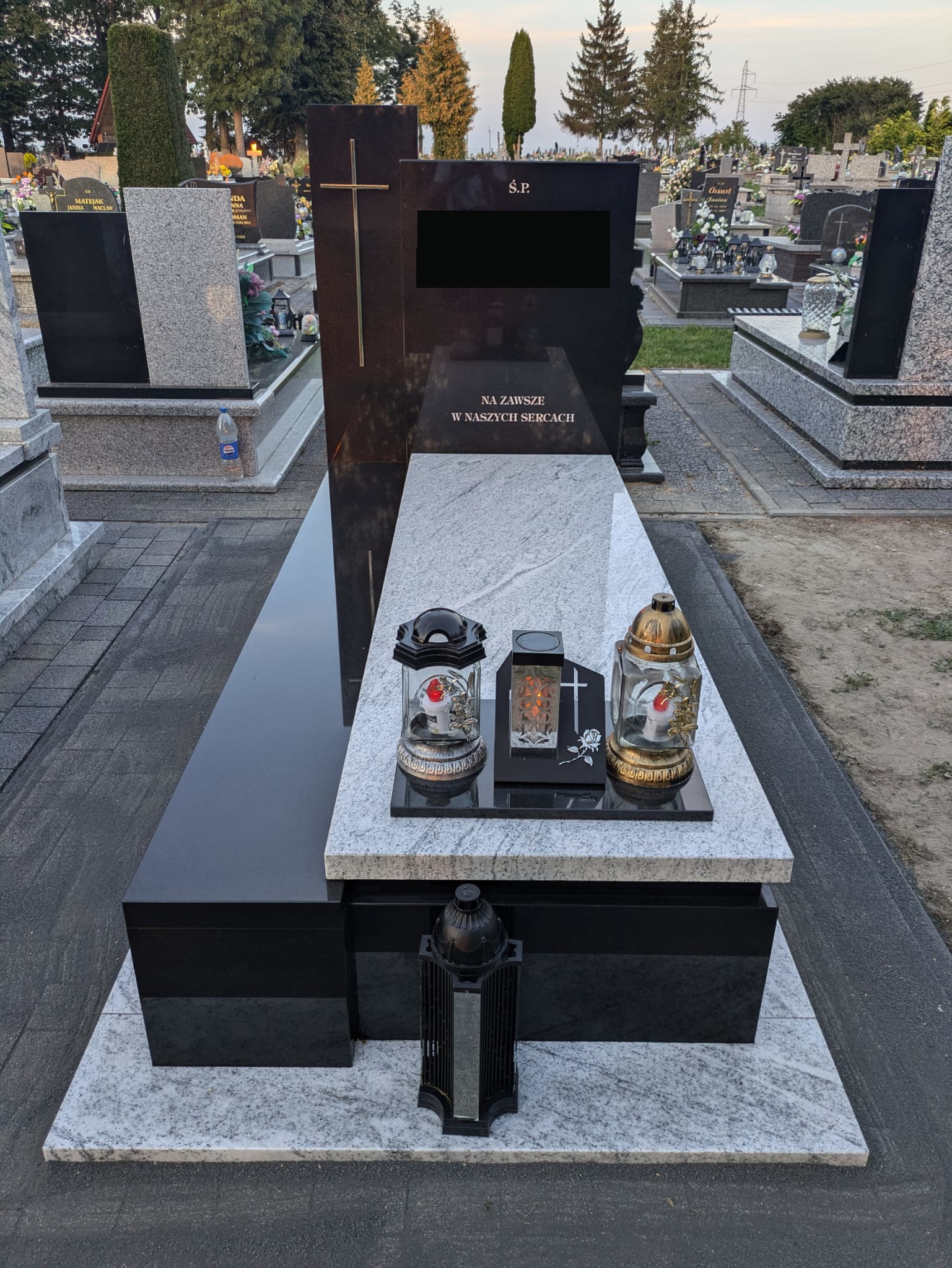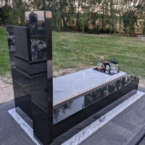 Nagrobek w Jarczowie Nowoczesny nagrobek na cmentarzu w Jarczowie. Wykonano go z dwóch rodzajów granitu. Charakterystycznym elementem jest czarna dwuczęściowa tablica obniżona i wysunięta poza główną bryłę lewa część pokrywy. Może ci się spodobać również Nagrobek w gminie Lubaczów 2023-04-02 Grobowiec w niebieskim odcieniu granitu 2025-04-29 Pojedynczy pomnik w Bełżcu 2023-01-20