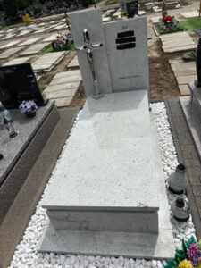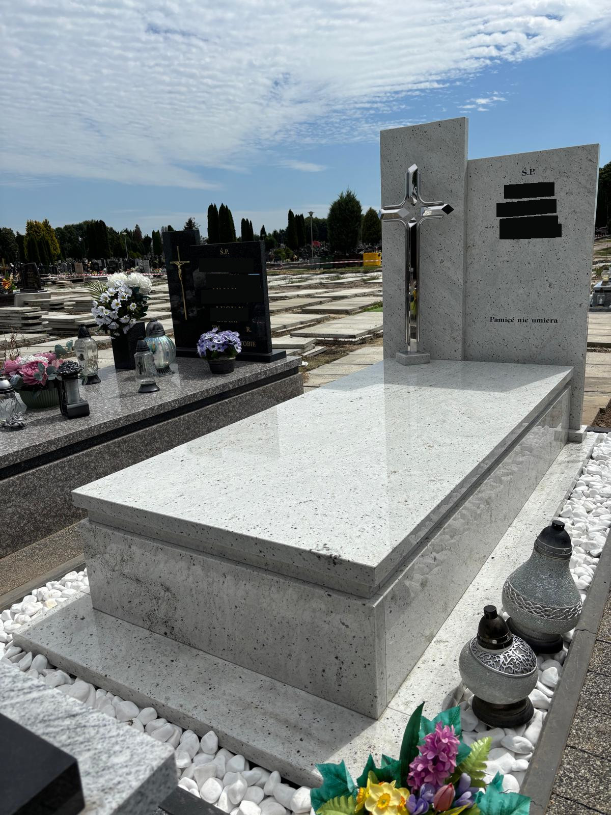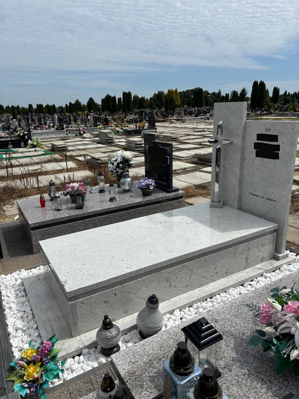 Nagrobek w Zamościu Nagrobek z jasnego granitu na cmentarzu w Zamościu. Przed tablicą zamontowano srebrny stalowy krzyż. Niecodziennym rozwiązaniem jest zastąpienie kostki brukowej białymi kamyczkami. Może ci się spodobać również Nagrobek w Tomaszowie Lubelskim 2023-08-08 Schody zewnętrzne o nieregularnym kształcie 2025-09-15 Nagrobek z rzeźbą 2025-04-14