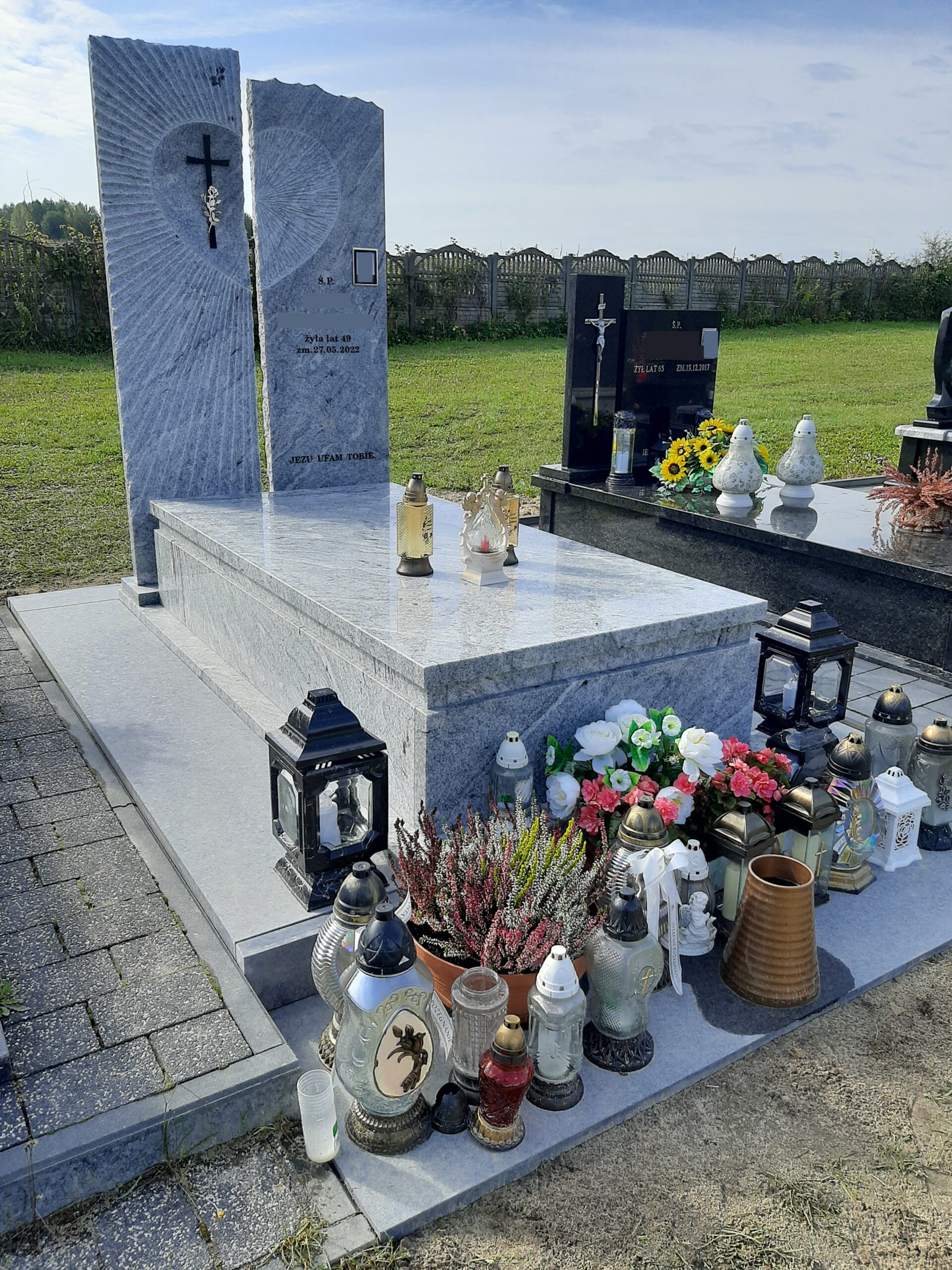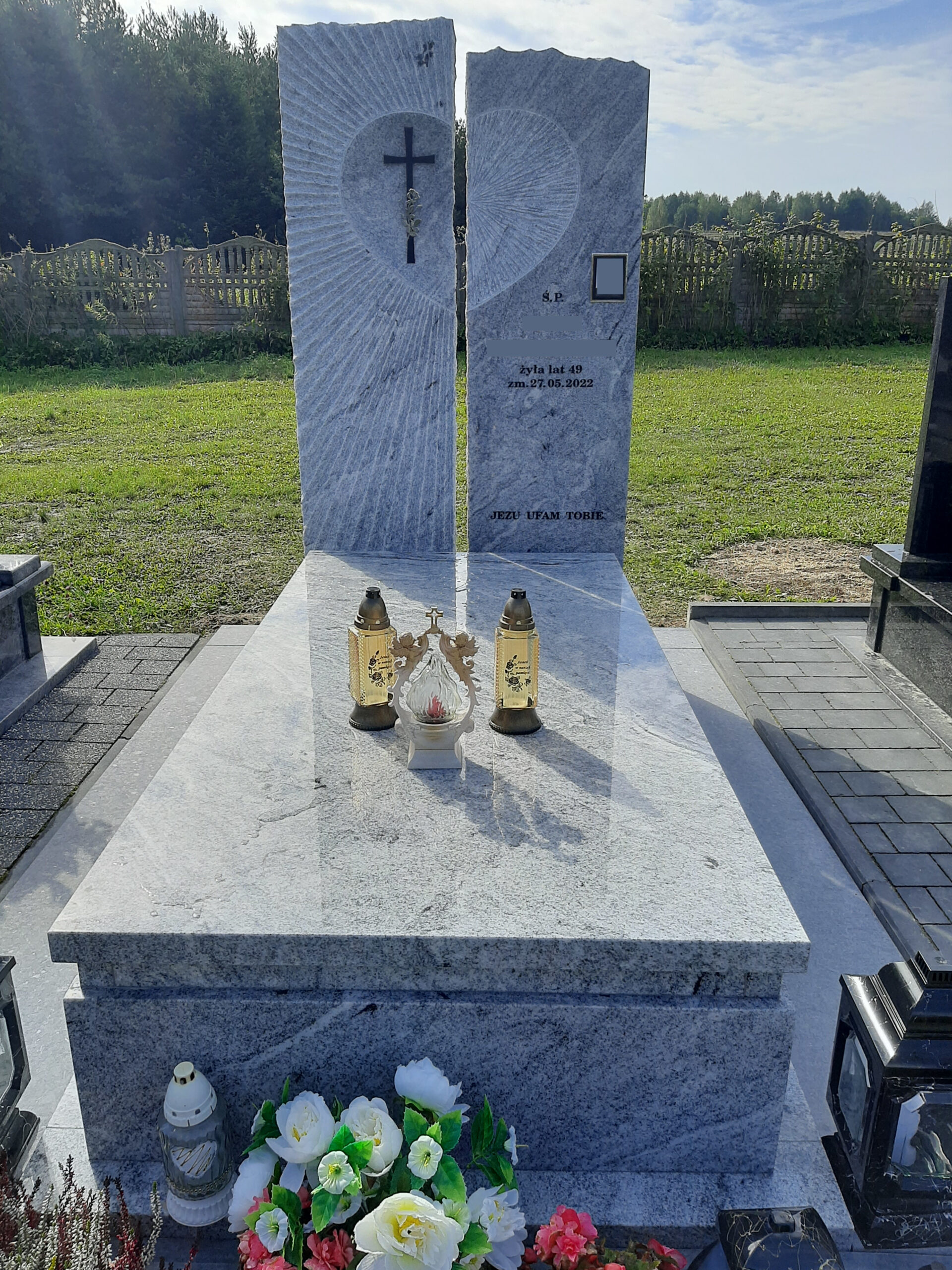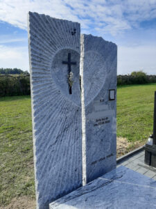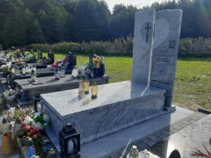Nagrobek według indywidualnego projektu z białego granitu viscount white powstał na cmentarzu w miejscowości Bełżec. Tablica składa się z dwóch elementów z rzeźbą przedstawiającą serce od którego odchodzą promienie. Napisy i krzyż w kolorze czarnym. Zamiast standardowej kostki brukowej zastosowano płyty z niepolerowanego granitu.
