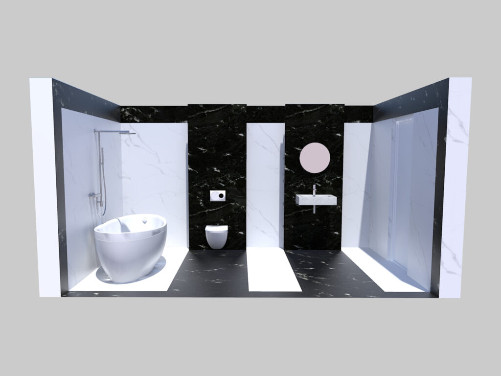 W projekcie łazienki użyto kontrastujących kolorów kamienia: czarnego marmuru oraz białego marmuru Bianco Carrara. Z czarnego kamienia wykonano ,,obramowanie” pomieszczenia oraz częściowo posadzkę oraz ścianę przy misce ustępowej oraz umywalce. Białym kamienień wykończono pozostałe ściany oraz posadzkę.Dodatkowo za wysuniętą ścianką przy misce ustępowej oraz umywalce zaprojektowano ukryte półki.
