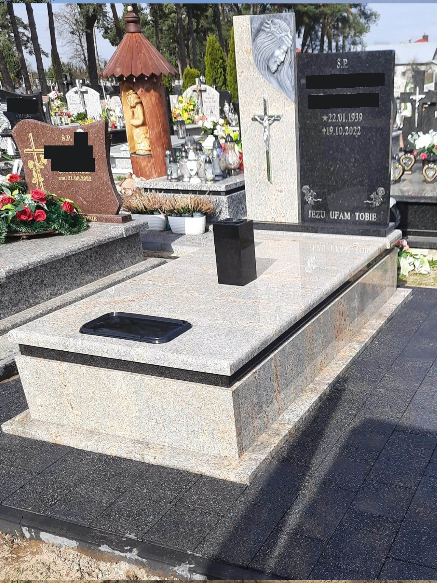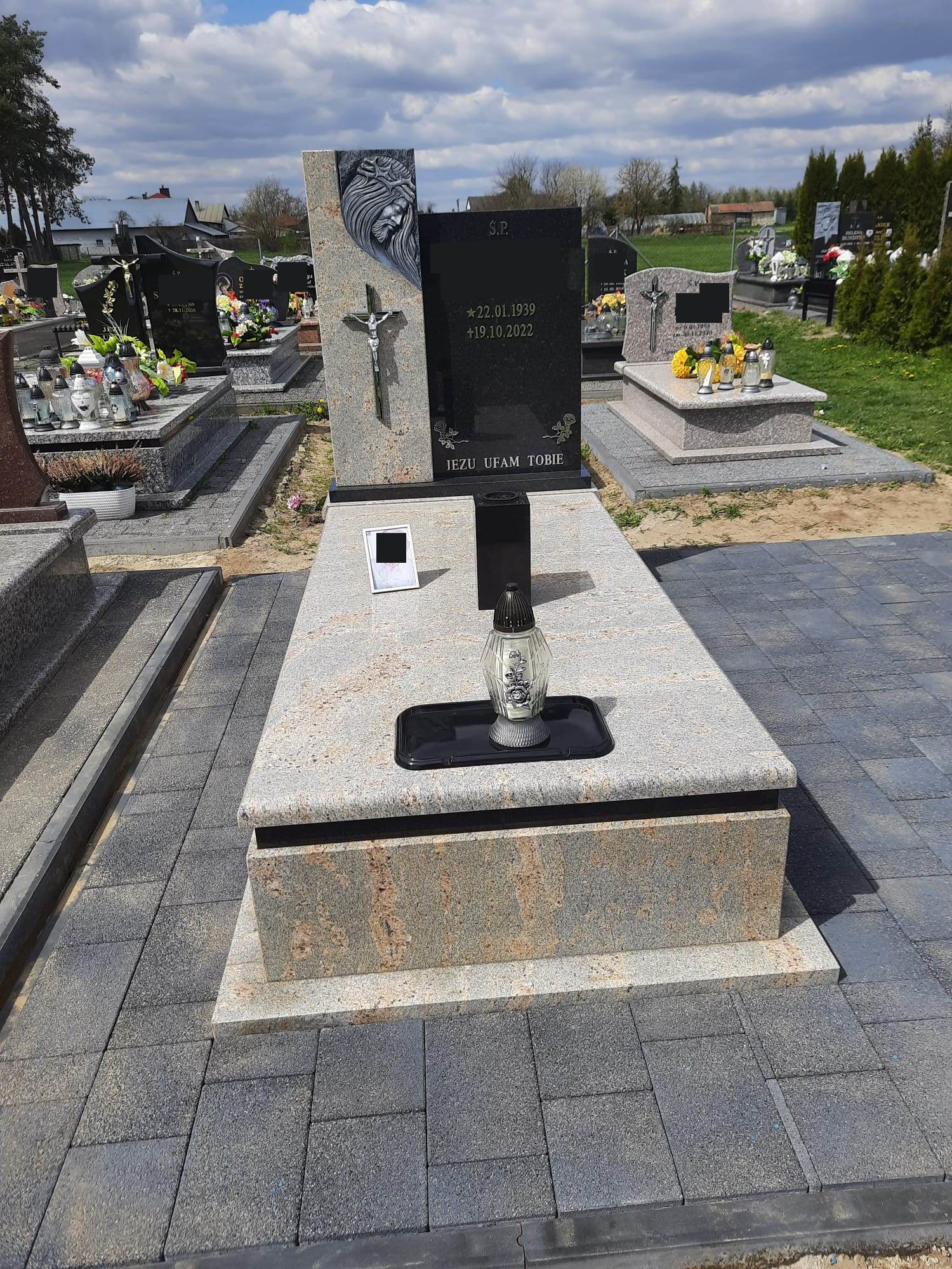 Nagrobek w Cieszanowie powstał z połączenia dwóch rodzajów rodzajów granitu: jasnego Kaszmiru Gold oraz ciemnego Nero Angoli. Z jasnego kamienia wykonano parapety, obłożyny, pokrywę grobową oraz prawą część tablicy z wizerunkiem Jezusa Chrystusa, natomiast pozostałe elementy pomnika zrealizowano z czarnego kamienia. Napisy oraz krzyż wykonano w kolorze srebrnym. Dookoła nagrobka została ułożona kostka brukowa.
