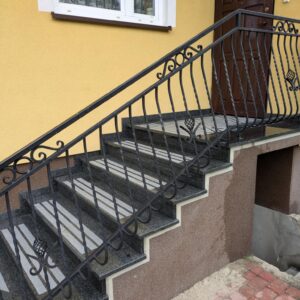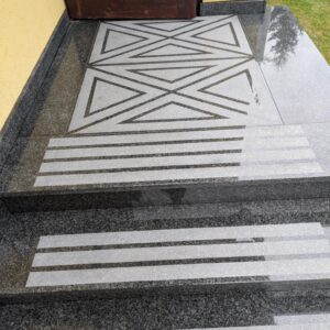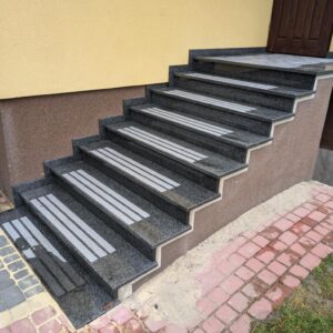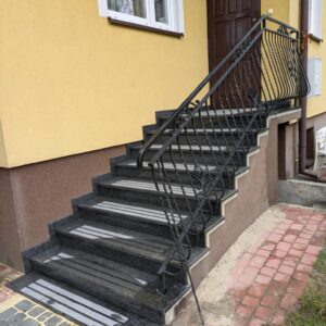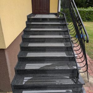 Schody zewnętrzne wykonano z ciemnego granitu. Kamień ten bardzo dobrze nadaje się do stosowania na zewnątrz budynku. Jest on odporny na warunki atmosferyczne. W celu zapobiegnięcia pośliźnięciom zastosowano piaskowane paski na stopniach oraz piaskowany wzór składający się z trójkątów na spoczniku.