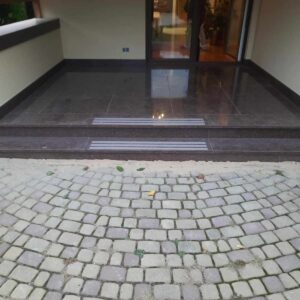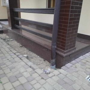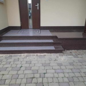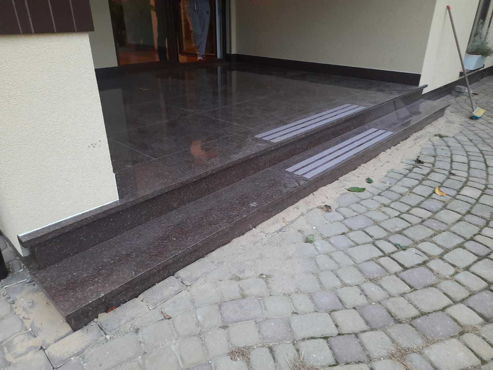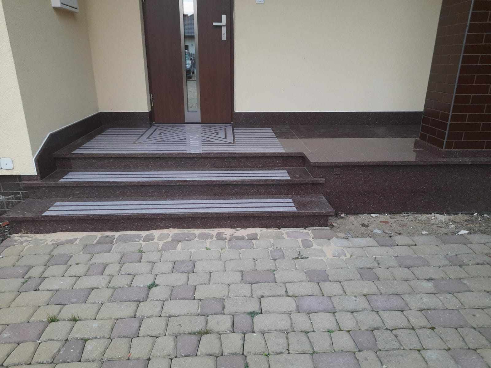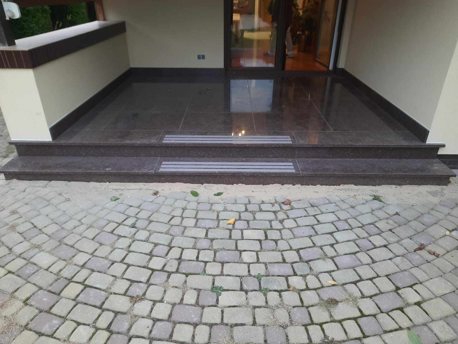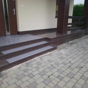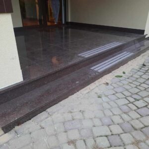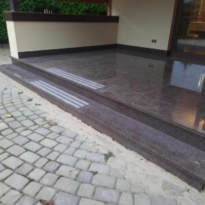 Schody wejściowe oraz taras zostały wykonane z granitu w odcieniu czerwonym o nazwie Tołkowski. Przed wejściem głównym znajduje się podest oraz dwa stopnie które zabezpieczono antypoślizgowo poprzez piaskowane w kamieniu pasy. Ten sam zabieg jednak o innym wzorze zastosowano na podeście. Na tarasie z drugiej strony domu nie było to konieczne, taras jest w całości zadaszony.